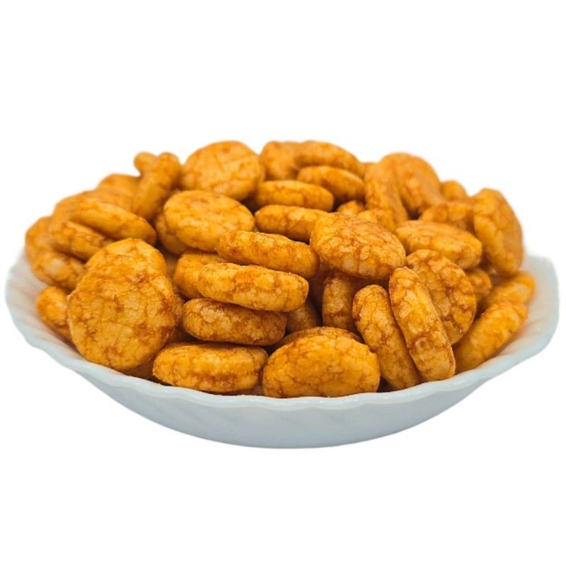 Iškepti apvalūs originalūs oriniai ryžių krekeriai su šiek tiek saldaus sojos padažo skoniu.
