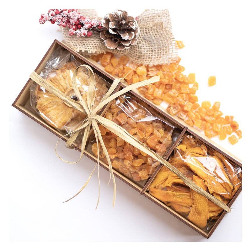 Dėžutės sudėtis: Džiovintos mangų skiltelės be pridėtinio cukraus 200g., Džiovinti ananasų žiedai be pridėtinio cukraus 100g., Džiovinti abrikosų kubeliai be pridėtinio cukraus 250 g.